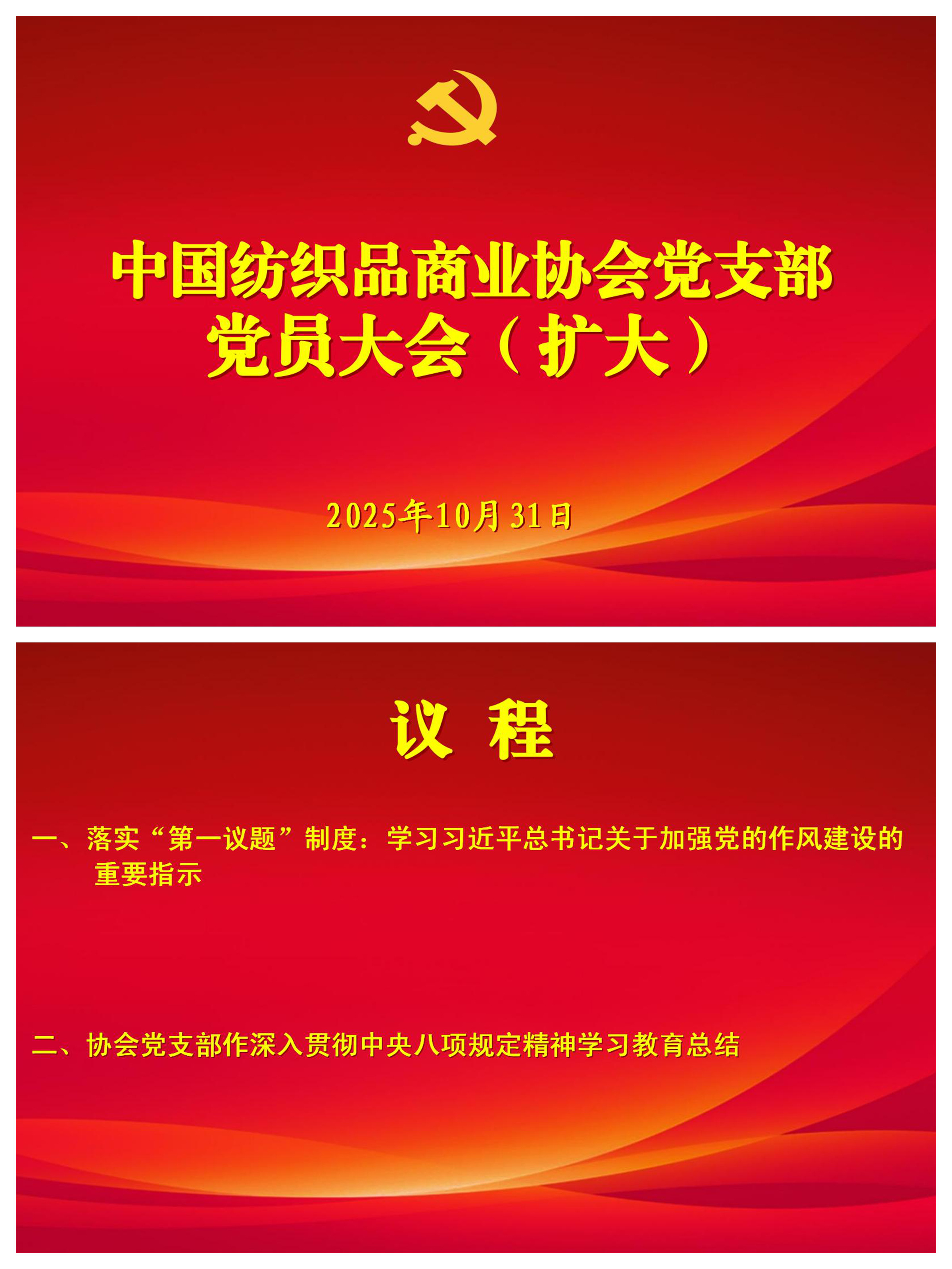 10月31日,中国纺织品商业协会党支部召开党员大会(扩大到全体职工),协会党支部书记雷利民领学习近平总书记关于加强党的作风建设的重要指示,作深入贯彻中央八项规定精神学习教育学习教育总结报告,围绕传达学习贯彻党的二十届四中全会精神作辅导。